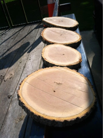 I hope that the holes will keep the cracks from growing too fast. Now I will let them dry out for a week or so before I sand them and put a varnish of some kind on them. Won't they look pretty with fall flowers and pumpkins on the table? I was thinking about some plaid fabric for napkins and ribbons for the fall holidays. I'll let you know how they look in a few days.